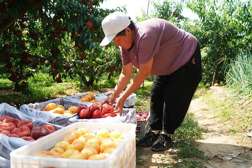 7月18日,在北京市平谷区大华山镇的一处桃园,桃农整理采摘好的桃子。