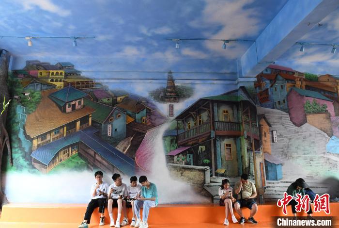 民众在巨型涂鸦墙前玩耍休息。(图片来源:中新社)
