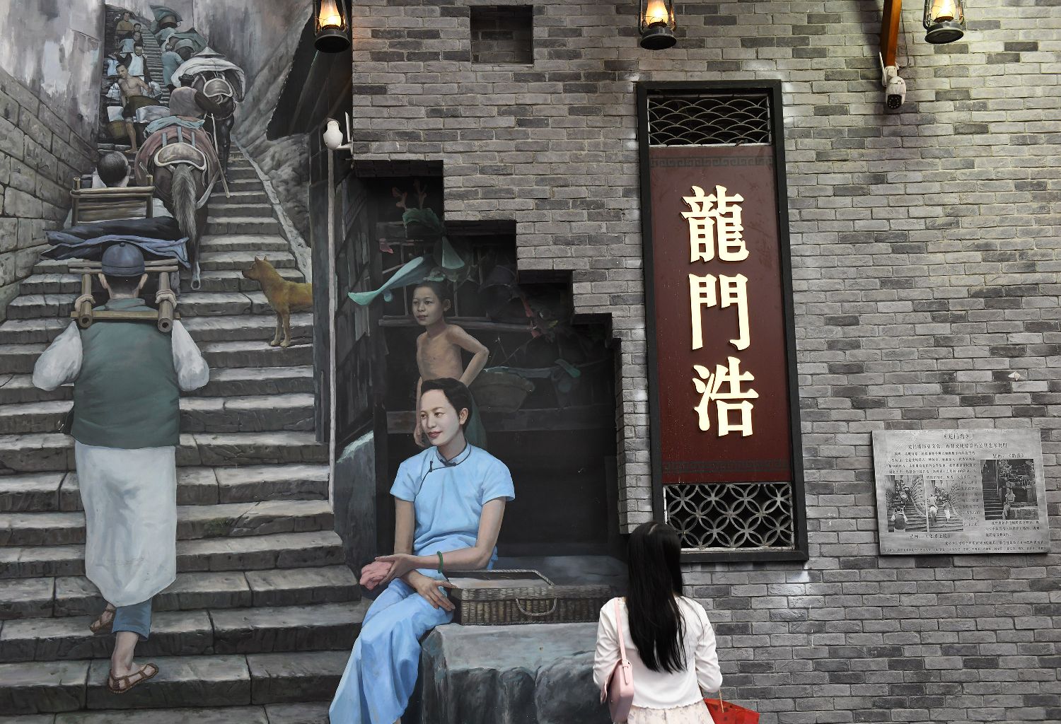 龙门浩老街一处地面立体彩绘吸引小朋友体验。(图片来源:中新网)