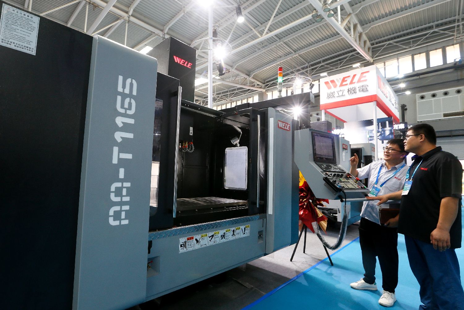 7月18日,参展商在2023青岛国际机床展览会上调试铣削设备。(图片来源:新华社)