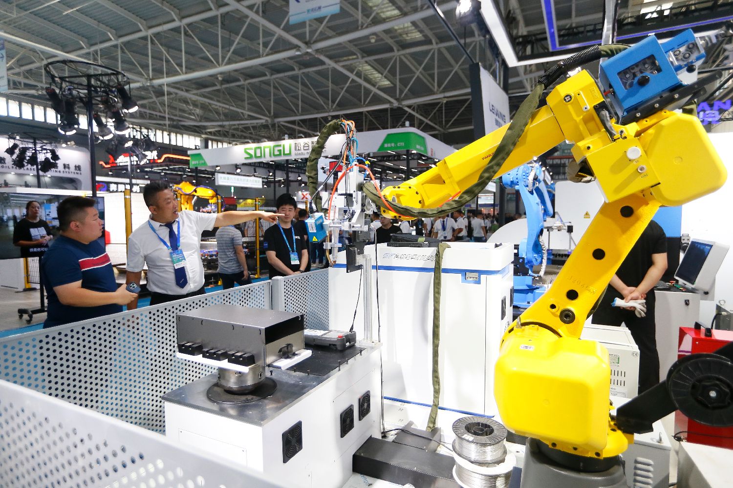7月18日,参观者在2023青岛国际机床展览会上了解焊接机器人。(图片来源:新华社)