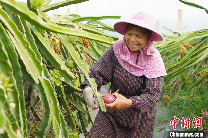 近日,走进广西贵港市港北区港城街道樟村火龙果种植示范基地,放眼望去,支架上火龙果藤相互缠绕,一颗颗紫红色的果实挂满枝头,绿藤红果相互映衬,生机勃勃。工人们穿梭在基地里采摘、搬运、分拣、装车,一片繁忙的景象。(图片来源:中新网)