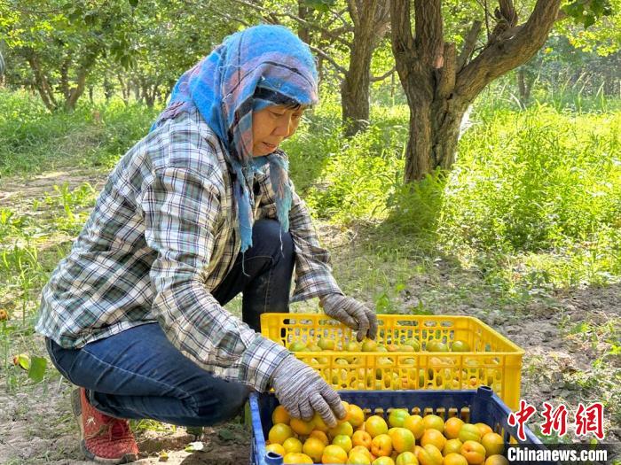 图为7月中旬,敦煌市月牙泉镇合水村村民王玉玲对采摘的敦煌李广杏进行装筐。(图片来源:中新网)