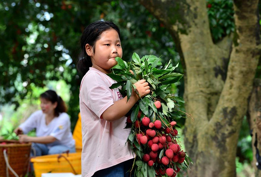 7月15日,一位小朋友抱着刚从树上采摘下来的荔枝。连日来,侨乡福建省永春县岵山镇的荔枝相继成熟,进入采摘季。(图片来源:本文图片除标注外均自中新社)
