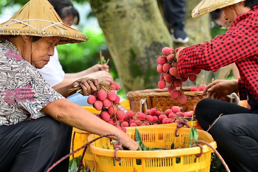 7月15日,果农在树下分拣刚采摘下来的荔枝,按大小分类装箱。