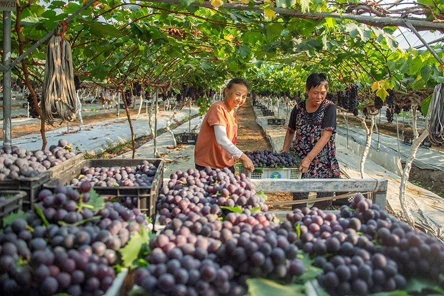 7月18日,四川省眉山市彭山区,3万余亩葡萄陆续成熟,进入采摘期,葡萄园里一派繁忙丰收景象。图为果农将刚采摘的新鲜“长青玫瑰”葡萄抬上车。