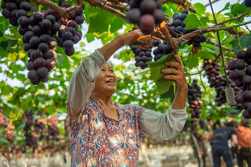 7月18日,四川省眉山市彭山区,3万余亩葡萄陆续成熟,进入采摘期,葡萄园里一派繁忙丰收景象。图为果农采摘“长青玫瑰”葡萄。