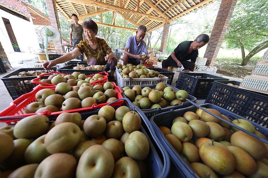 2023年7月18日,在江西省抚州市东乡区黎圩镇浯溪村枫明梨园,果农正在对蜜梨进行拣剔、装箱供应市场。