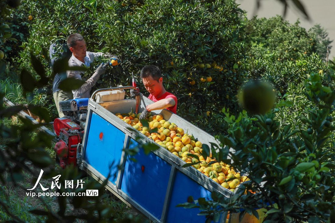 7月17日,秭归县泄滩乡坊家山村村民对刚收获的夏橙进行装车。盛夏时节,三峡库区湖北省宜昌市秭归县的夏橙进入收获期,夏橙是柑橘错季销售、调节水果市场的时令果品,已成为果农致富的“黄金果”。(图片来源:人民网)
