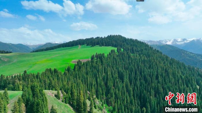 昭苏县云端草原平均海拔2500米,由于地势较高,与天山相连,在高处可俯瞰昭苏大地,草原紧挨天山木扎尔特冰川,距离昭苏县城60公里,是昭苏高原优质的夏牧场。图为连绵起伏的山峦像大自然肆意涂抹的画板。(图片来源:中新网)