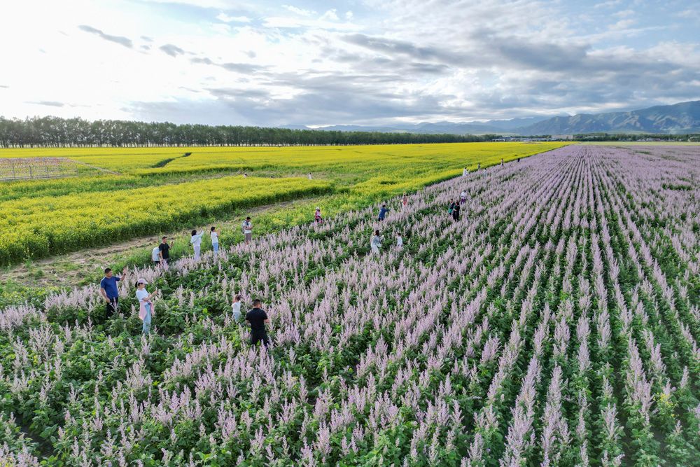 进入夏季,位于新疆伊犁河谷的伊犁哈萨克自治州昭苏县进入了一年中最美的季节。在蓝天白云映衬下,油菜花、香紫苏和大片麦田随风摇曳,让游客流连忘返。图为游客在新疆伊犁哈萨克自治州昭苏县一处香紫苏花海景区游玩。(图片来源:新华社)