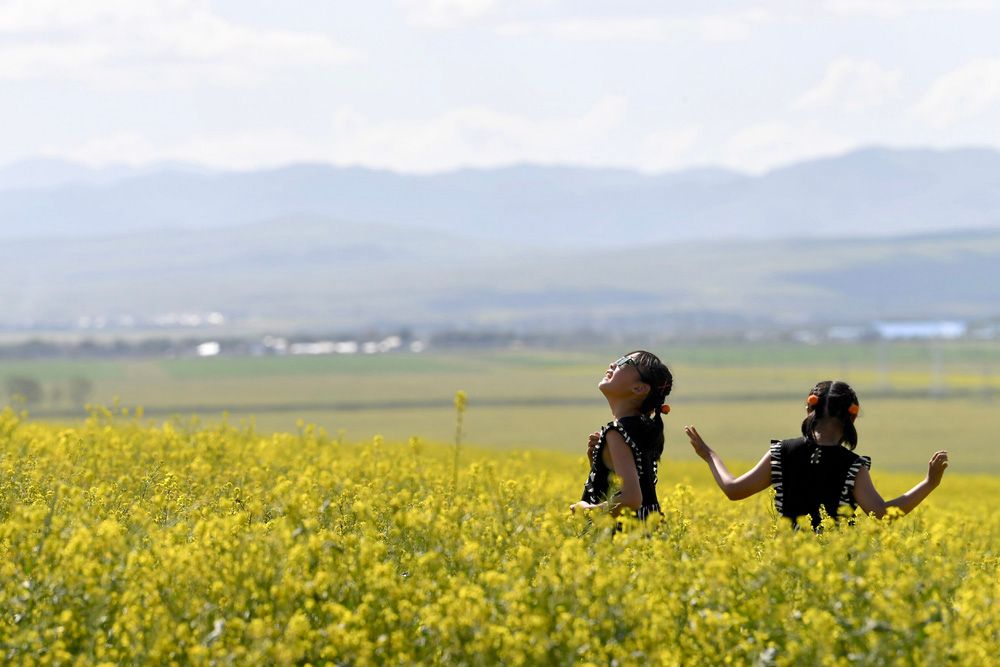 昭苏水土资源得天独厚,农牧资源品质优良,有覆盖优质黑钙土耕地150万亩,世界级优质天然草场736.95万亩,享有“中国天马之乡”“中国褐牛之乡”“中国油菜之乡”“中国彩虹之都”美誉。图为小朋友在新疆伊犁哈萨克自治州昭苏县油菜花田里玩耍。(图片来源:新华社)