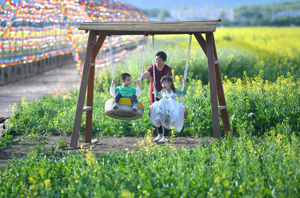 小朋友在新疆伊犁哈萨克自治州昭苏县油菜花田里荡秋千。(图片来源:新华社)