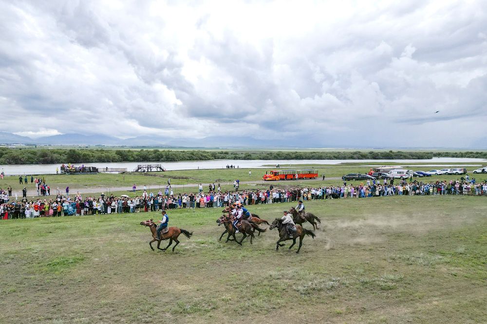 游客在新疆伊犁哈萨克自治州昭苏县湿地公园景区观看民俗表演。(图片来源:新华社)