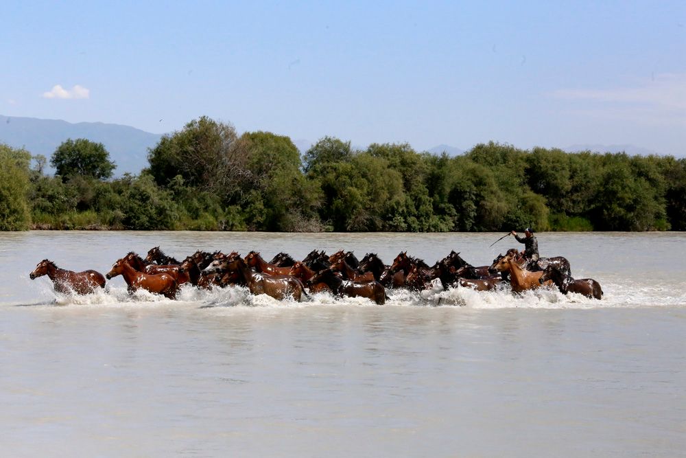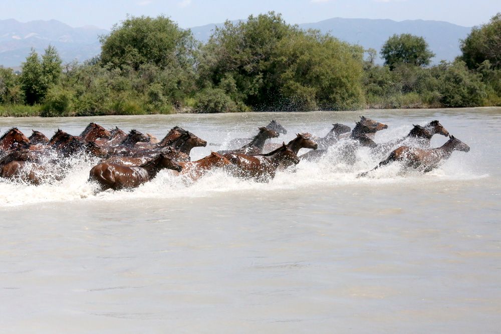 7月15日,新疆昭苏县在特克斯河举行“天马浴河”表演,牧民赶着马匹从河床飞驰而下,赶马人一声号令,马瞬间奋蹄奔腾而起,河面上水花飞溅四射,场面壮观奇美。(图片来源:中新社)