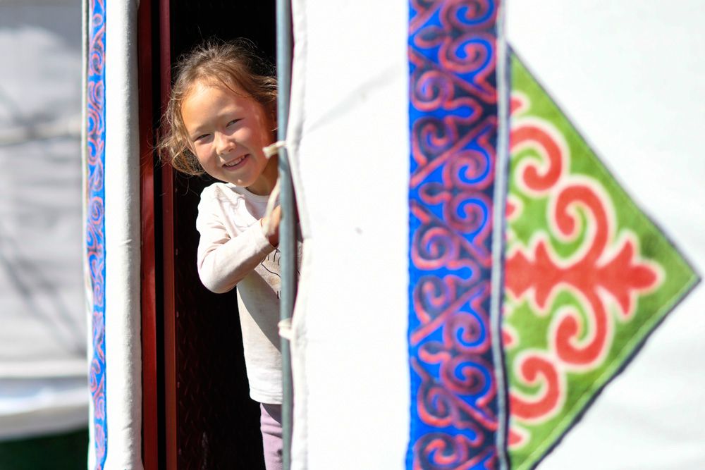 7月18日,在新疆伊犁哈萨克自治州昭苏县一处毡房内,一名小朋友探出身来张望。(图片来源:新华社)