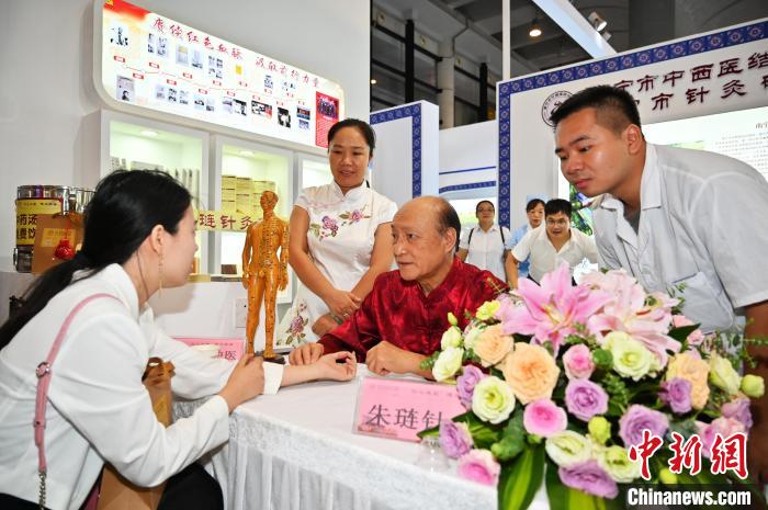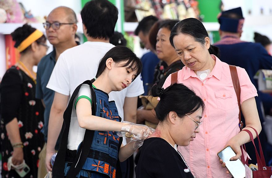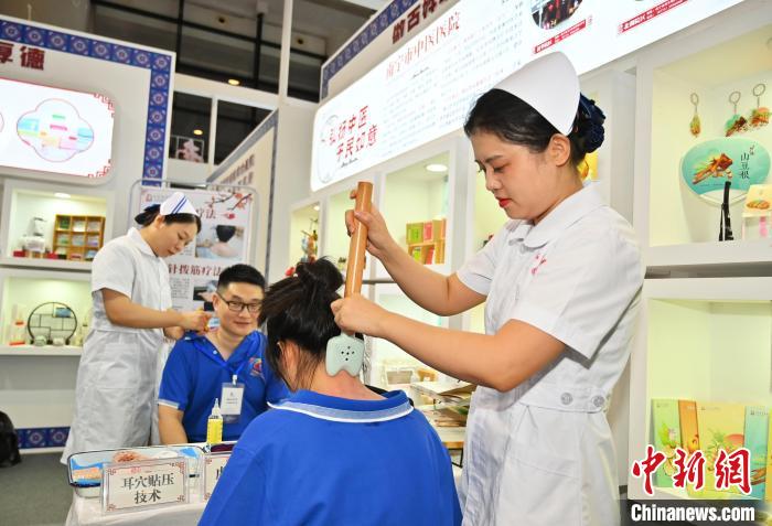 7月22日,在广西南宁国际会展中心,人们在中医药产业展览现场体验中医理疗。(图片来源:新华社)