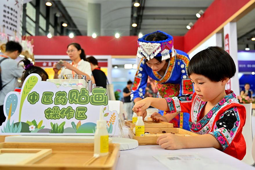 7月21日,首届广西中医药产业交流大会在南宁市开幕,图为一孩童体验制作中医药贴画。 (图片来源:中新社)