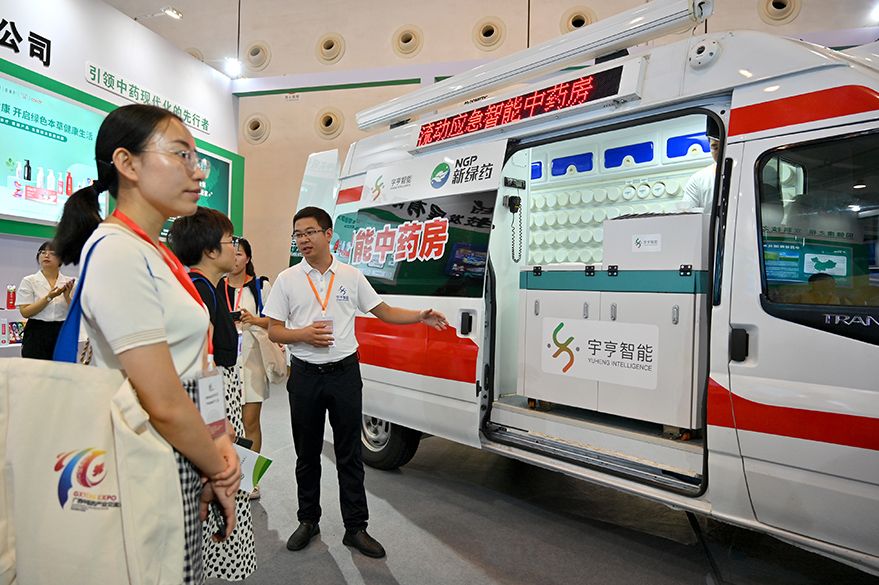 图为一参展商向观众介绍流动应急智能中药房。 (图片来源:中新社)