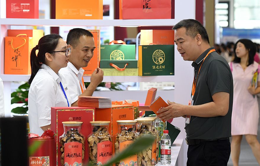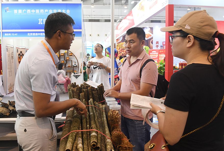 7月22日,在广西南宁国际会展中心,人们在中医药产业展览现场交流。(图片来源:新华社)