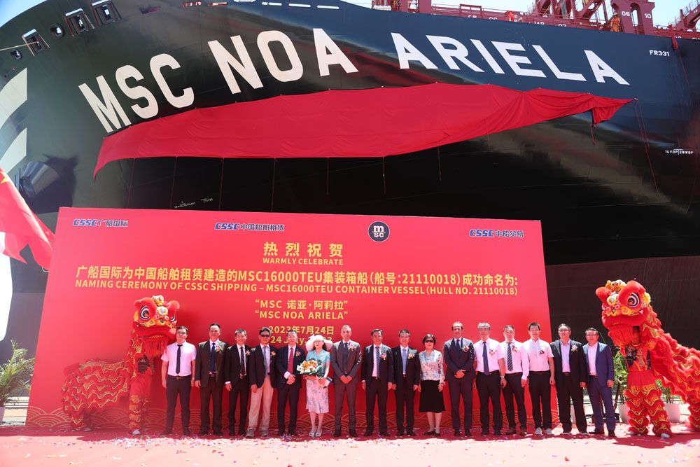 7月24日,MSC16000TEU集装箱船1号船在广州南沙命名交付。该船船长366米,型宽51米,型深30.2米,设计吃水14.5米,最多可运载16616个标准集装箱,是目前华南地区建造的最大吨位的集装箱船。图为命名仪式现场。(图片来源:中新社)