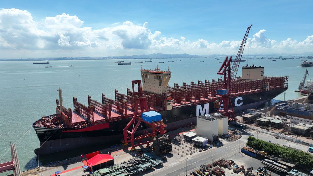 该型船于2021年3月签订建造合同,计划在广船国际建造8艘,由MSC地中海航运公司下单建造,中国船舶租赁公司和招银金融租赁有限公司以直租形式给予融资。(图片来源:中国央视新闻截图)