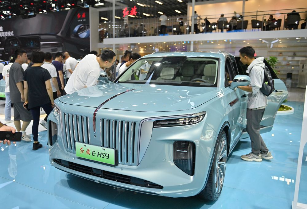 7月15日,第20届长春国际汽车博览会上的一款红旗新能源汽车吸引民众。(图片来源:中新社)