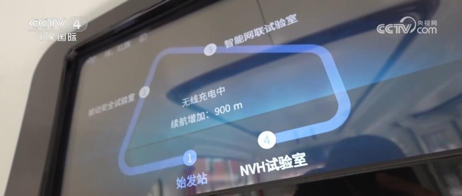 一辆无人驾驶的新能源汽车在一条有着特殊标识的内部道路上平稳行驶,而车内的仪表台显示车辆正在充电中。(图片来源:中国央视网)