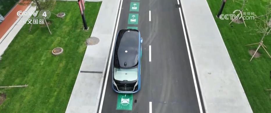 一辆无人驾驶的新能源汽车在一条有着特殊标识的内部道路上平稳行驶。(图片来源:中国央视网)