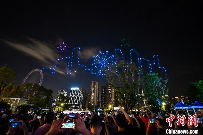 22日晚,500架无人机组成庞大编队在福建省福州市晋安湖畔夜空不断变换阵型,呈现“好年华聚福州”“才聚晋安”等字样和图案,吸引众多市民驻足观赏、拍照。(图片来源:中新网)