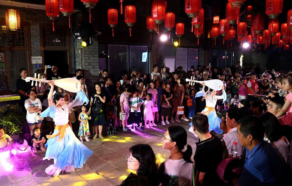 游客在陕西省汉中市留坝县老街上观赏文艺演出。当地围绕高山景区、民俗老街、现代民宿、研学旅游等不断丰富旅游业态,吸引游客度假避暑。(图片来源:新华社)