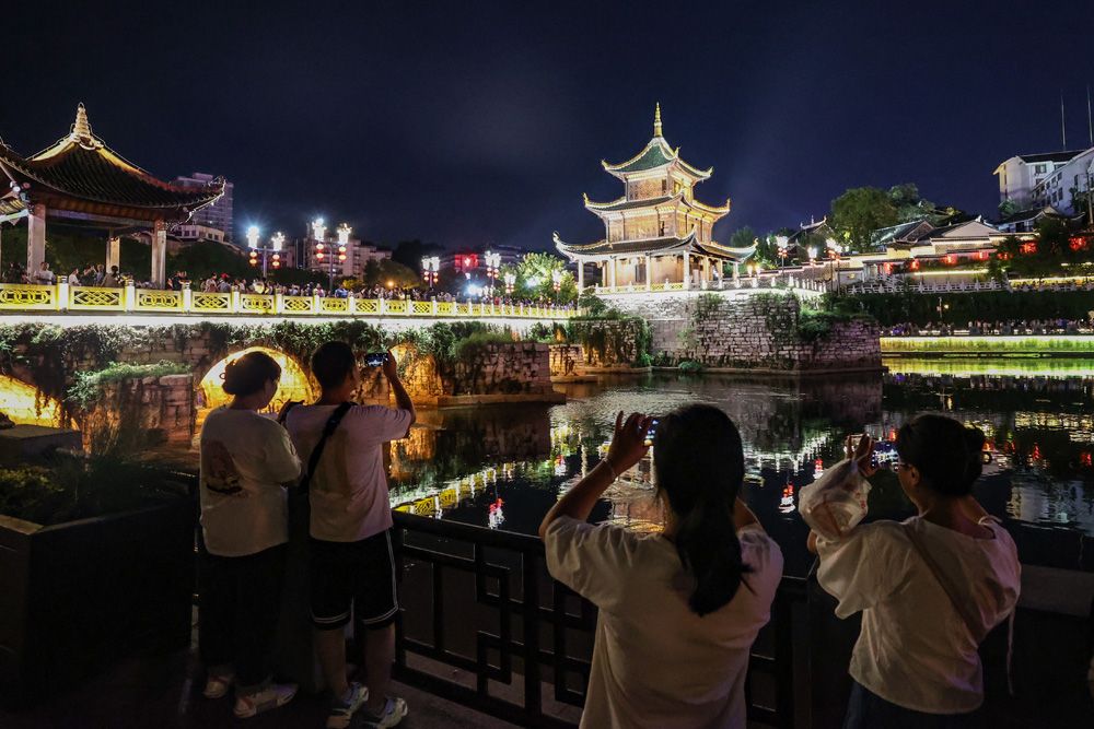 25日晚,游客在拍摄甲秀楼。当晚,位于贵州省贵阳市南明区的甲秀楼景区吸引众多游客游览、拍照打卡,享受贵阳“凉爽”的夏天。