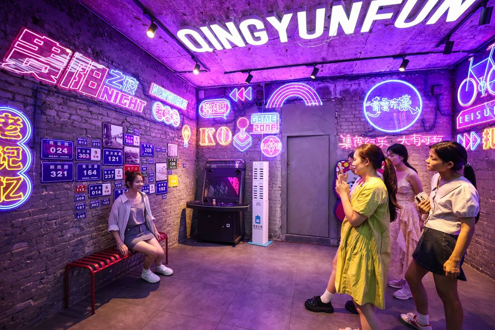 25日晚,游客在贵阳市南明区青云市集拍照打卡。入夏以来,贵州省贵阳“网红打卡地”青云市集吸引不少民众晚上游览、品尝美食,夜间消费人气旺。