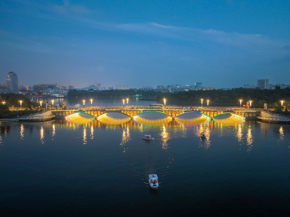 25日晚,吉林省长春市南湖大桥点亮灯光,市民乘游船欣赏大桥夜景。