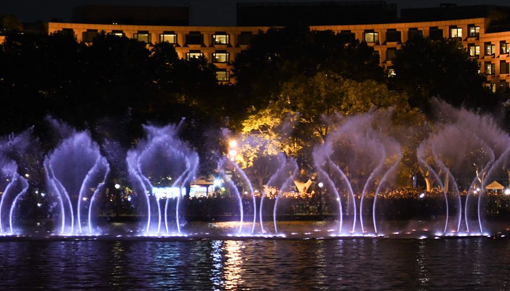 25日,浙江杭州西湖音乐喷泉重新亮相,新的展演包含《梁祝》《七蛟龙》《鸿雁》,以及杭州亚运会推广歌曲《爱达未来》四首曲目。图为音乐喷泉随音乐“舞动”。