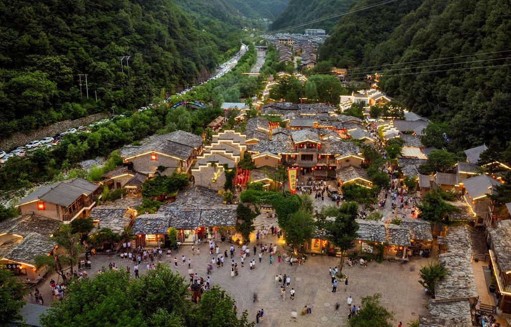 夜幕降临时的终南山寨。位于陕西省商洛市柞水县牛背梁脚下的终南山寨,是用石头述说陕南民居建筑历史的村寨,由秦岭老屋、阳坡院子、峡谷运动乐园、佬林客栈、终南山房、佬林养生苑等6大板块组成。游客可以品尝全国各地的小吃,体验水磨、打草鞋、磨剪子、捏糖人、老式打铁、露天电影等。众多游人在古寨幽径中感受诗意乡村、寻觅袅袅乡情。(图片来源:新华社)