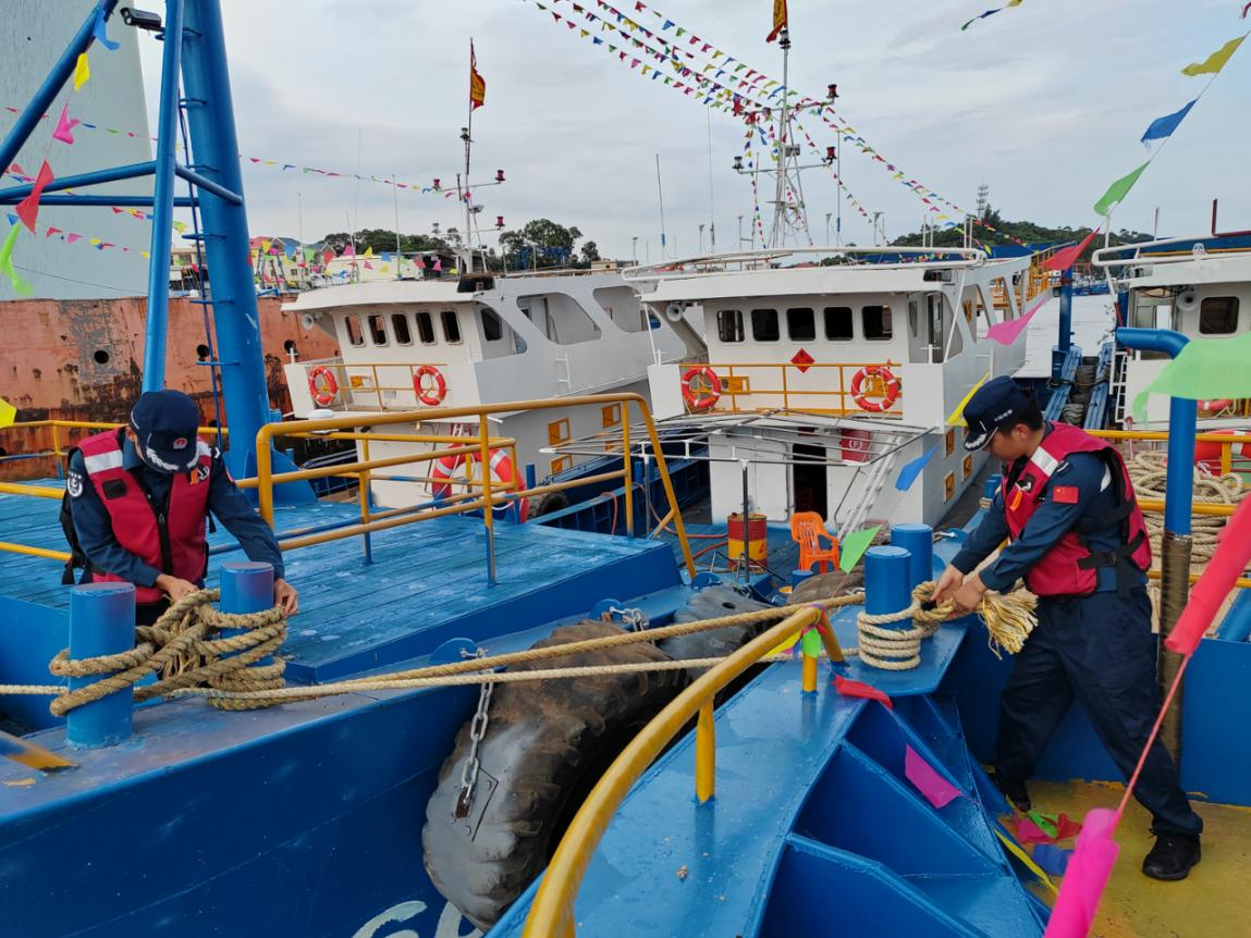漳州海警局执法人员帮助靠港船渔船加固缆绳。(图片来源:人民网发/漳州海警局供图)