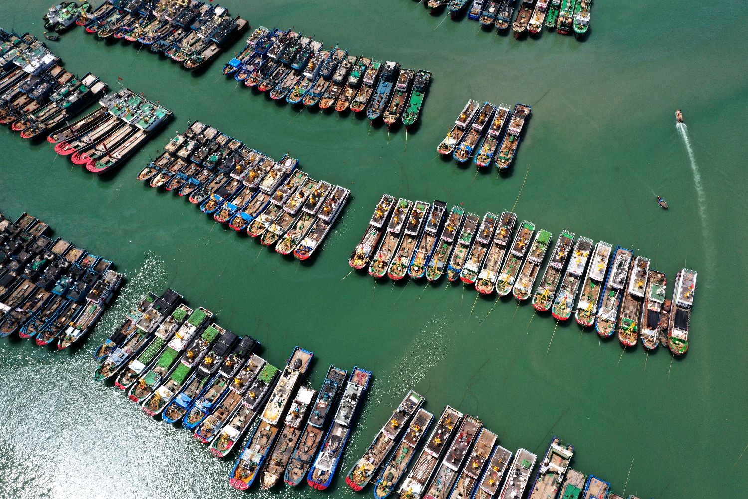 7月26日,渔船停靠在厦门高崎闽台中心渔港躲避台风(无人机照片)。(图片来源:新华社)