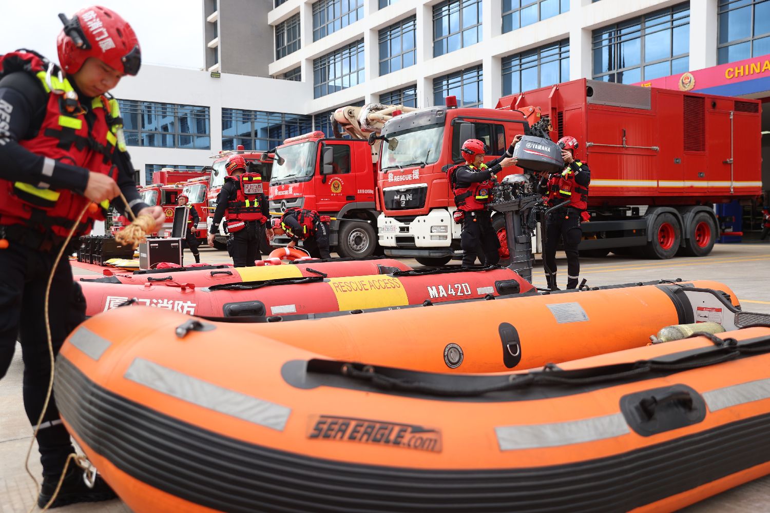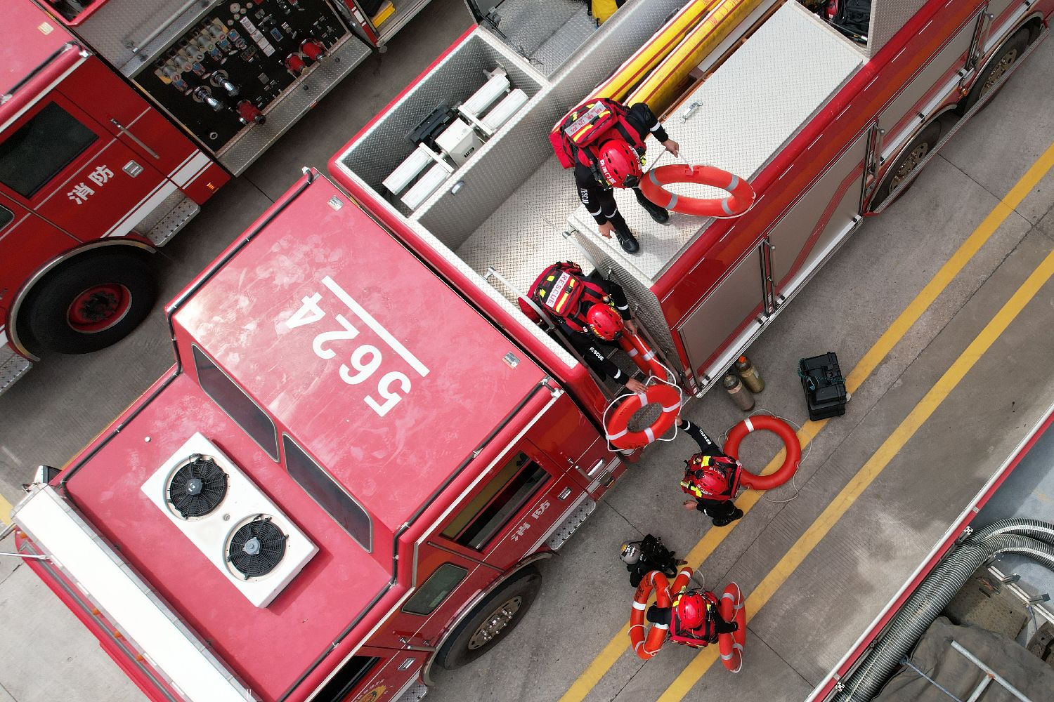 7月26日,在厦门市海沧区港区消防救援站,消防员将水上救生设备装上消防车(无人机照片)。(图片来源:新华社)