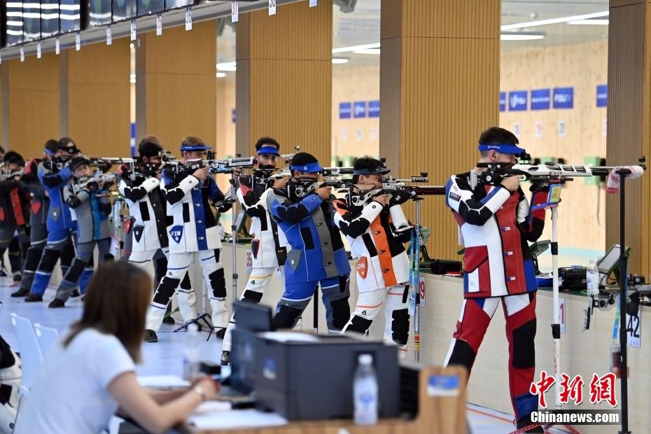 图为男子10米气步枪团体决赛比赛现场。当日,第31届世界大学生夏季运动会男子10米气步枪团体决赛在成都市射击运动学校举行,印度队、中国队、哈萨克斯坦队分获冠亚季军。(图片来源:中新网)