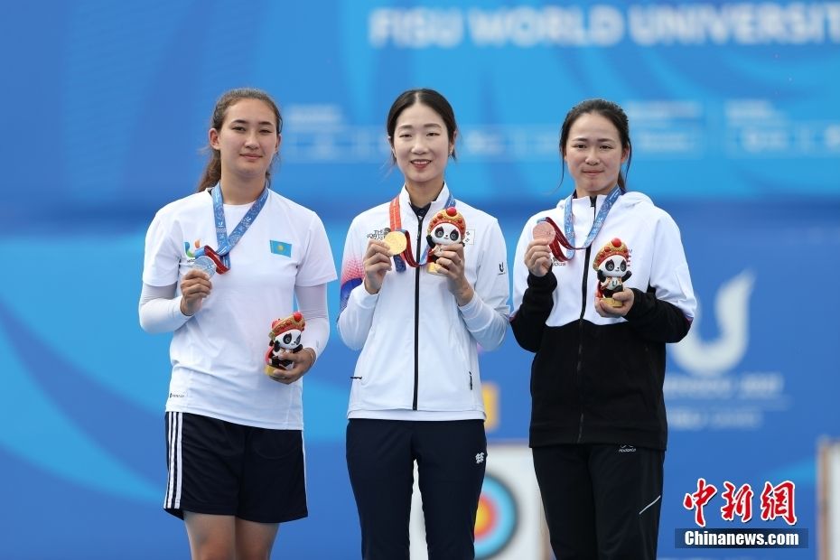 图为当日,第31届世界大学生夏季运动会射箭女子反曲弓个人决赛颁奖仪式在成都现代五项赛事中心马术体育场举行,韩国选手CHOI Misun获得金牌(中)、哈萨克斯坦选手TURSUNBEK Diana获得银牌(左)、中国台北选手彭家楙获得铜牌(右)。(图片来源:中新网)