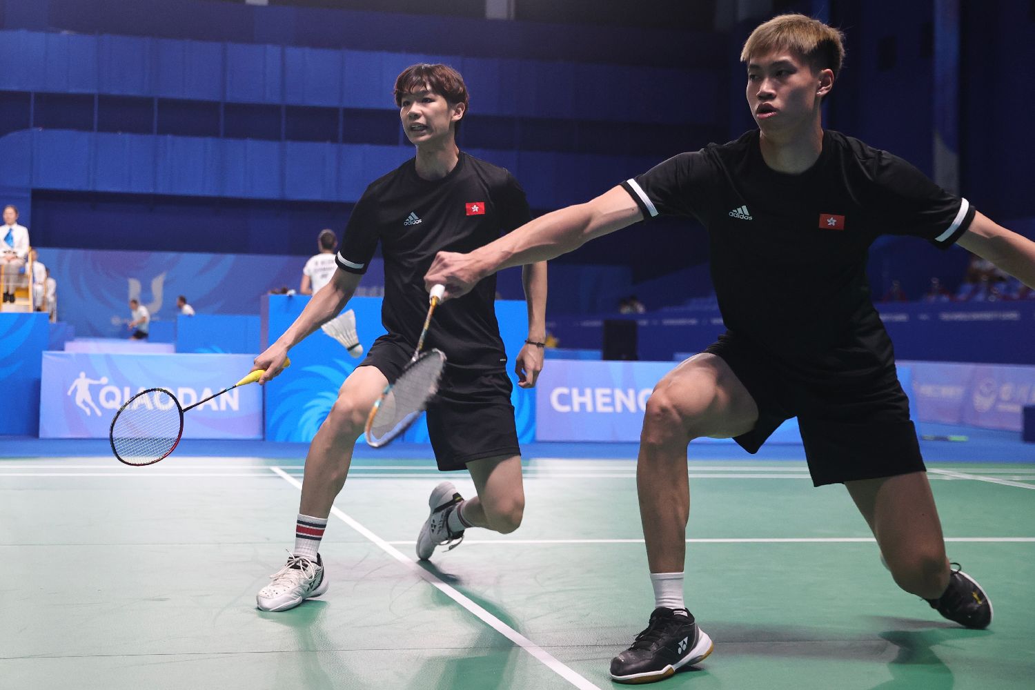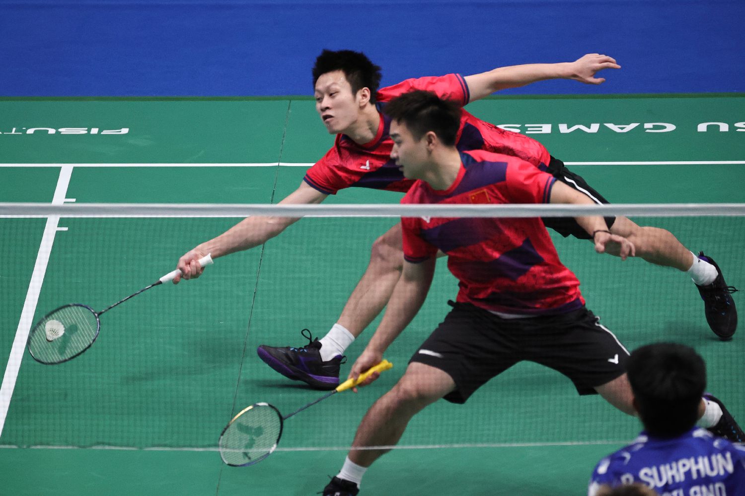 图为中国香港队组合庞立恒(右)/林穗禾在男子双打比赛中。当日,第31届世界大学生夏季运动会羽毛球混合团体赛在四川成都举行,中国香港队5:0胜爱沙尼亚队。(图片来源:中新社)