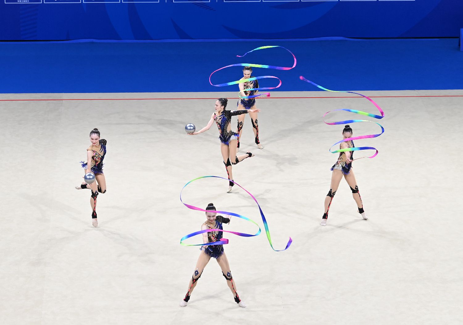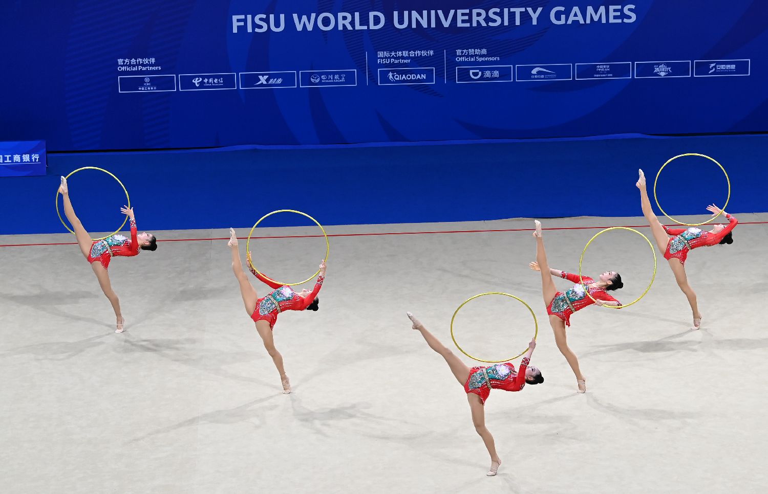 图为中国队在比赛中。当日,第31届世界大学生夏季运动会艺术体操集体5人圈操决赛在成都体育学院进行,中国队以30.900分获得金牌,日本队以28.500分获得银牌,乌克兰队以27.800分获得铜牌。(图片来源:中新社)