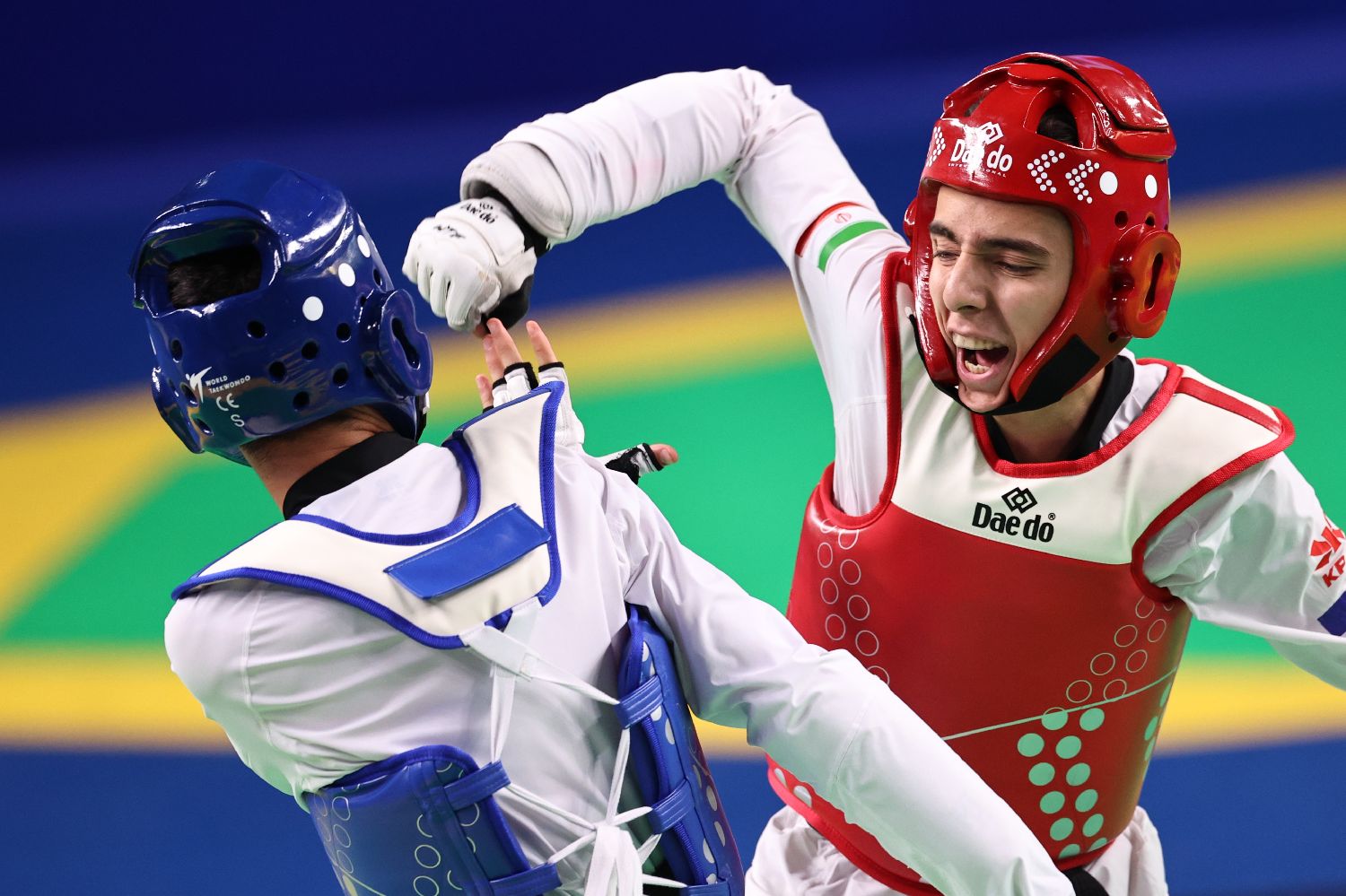 图为伊朗队选手HAJIMOUSAEINAFOUTI Mahd(红衣)在比赛中挥拳进攻。当日,第31届世界大学生夏季运动会跆拳道项目男子54kg决赛在成都举行,伊朗队选手HAJIMOUSAEINAFOUTI Mahd战胜乌兹别克斯坦选手OTAJONOV Omonjon夺得金牌。(图片来源:中新社)