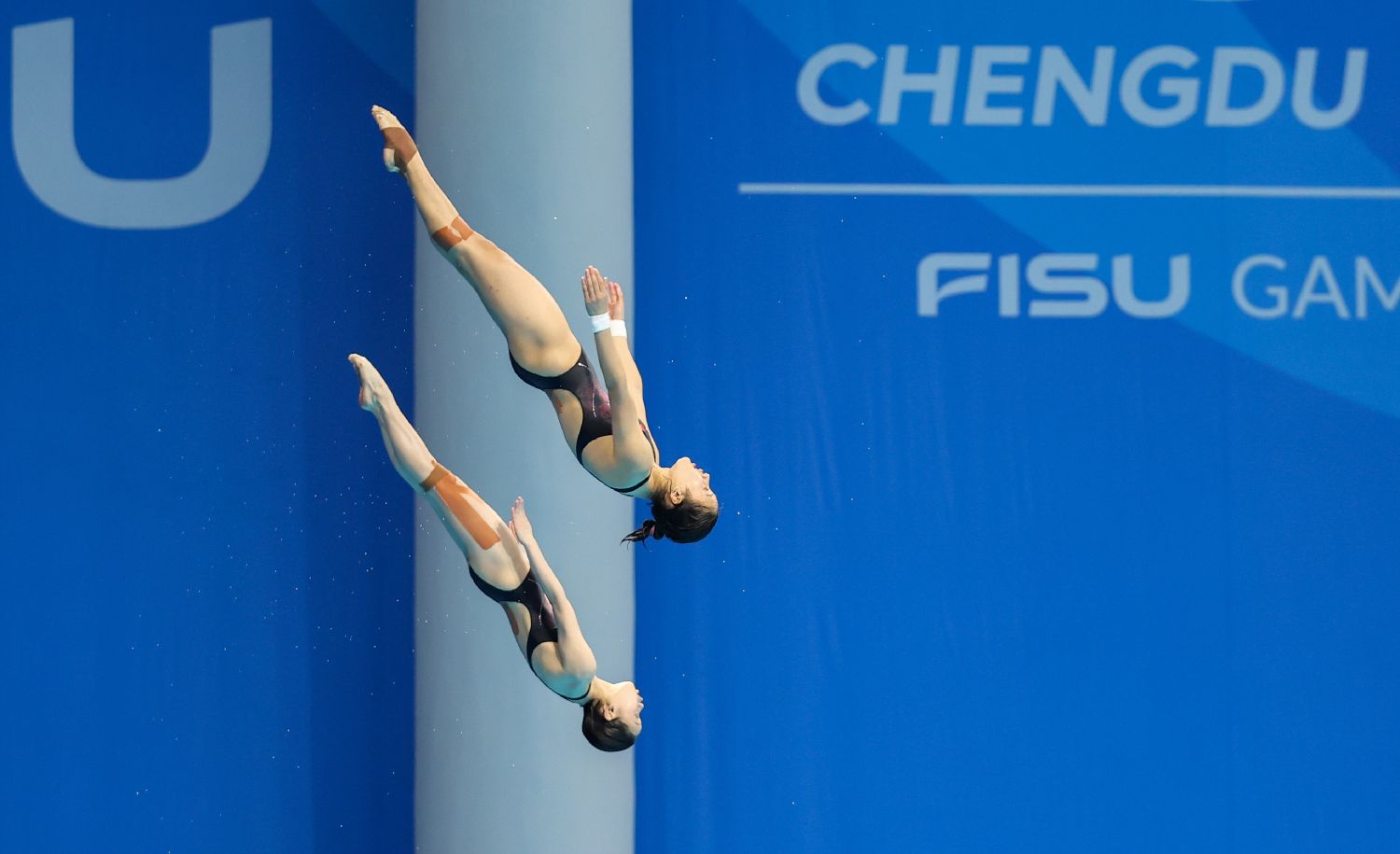 图为中国运动员张家齐(下)/掌敏洁在比赛中。当日,在成都举行的第31届世界大学生夏季运动会女子双人10米跳台决赛中,中国组合张家齐/掌敏洁以349.08分的成绩夺得冠军。(图片来源:新华社)