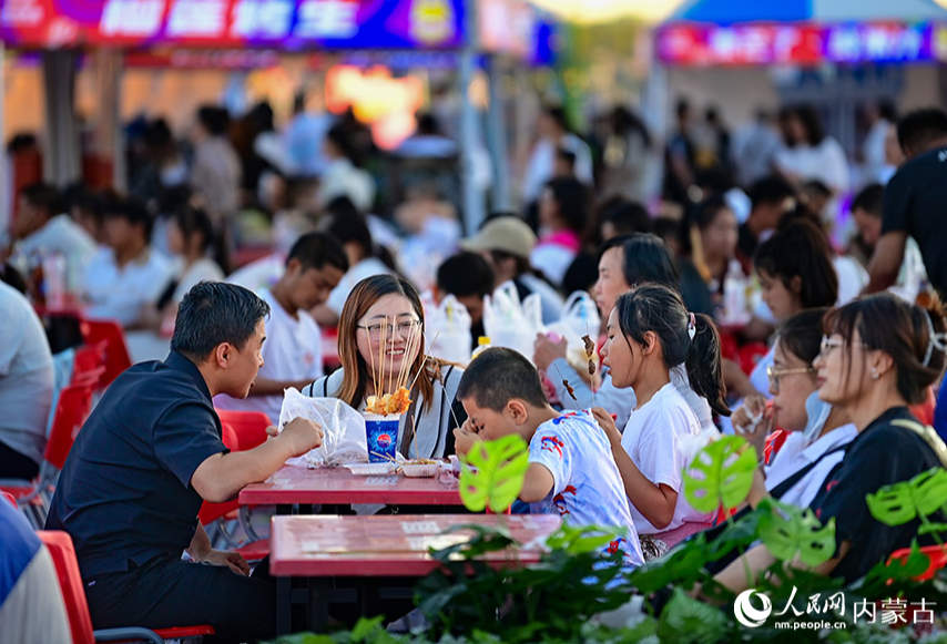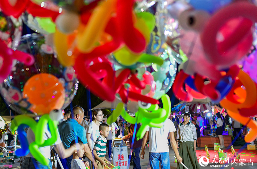 内蒙古鄂尔多斯市康巴什区持续打造夜间经济升级版,通过商旅文体融合发展,着力形成“夜味”“夜赏”“夜玩”“夜购”“夜读”等新业态产品供给,让夜间经济走上多重业态融合发展之路。图为游客在鄂尔多斯市康巴什区乌兰木伦文化和旅游街区夜市里休闲。