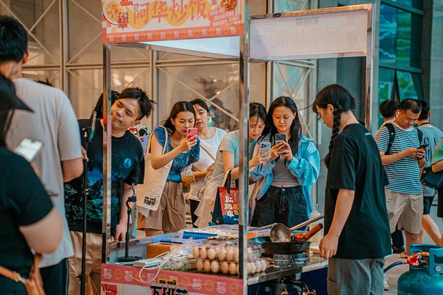 7月28日晚,南京市首个24小时消费街区——西城·夜未央活力街区正式启动“下班节”,这个以夜市、电音、电玩为主打的潮流夜生活节为期5周。图为企业员工下班后前来打卡。(图片来源:人民网发/建邺高新区供图)