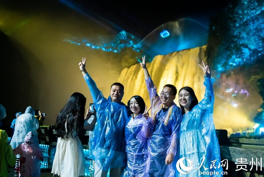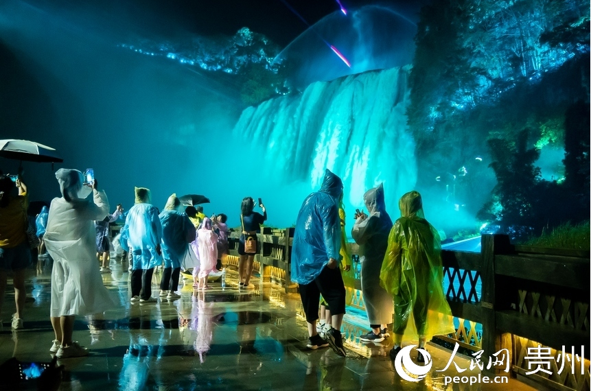 7月28日晚,夜幕降临,位于贵州省安顺市的黄果树旅游区内仍是人头攒动、游人如织,瀑布前五光十色的光影效果令游客们纷纷驻足观赏,打卡夜幕下的瀑布。