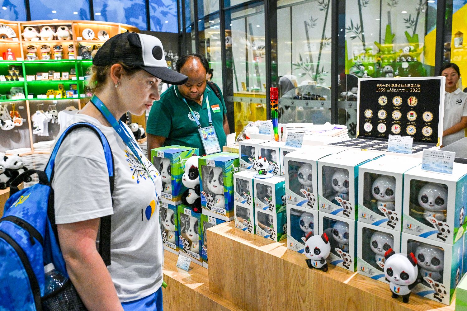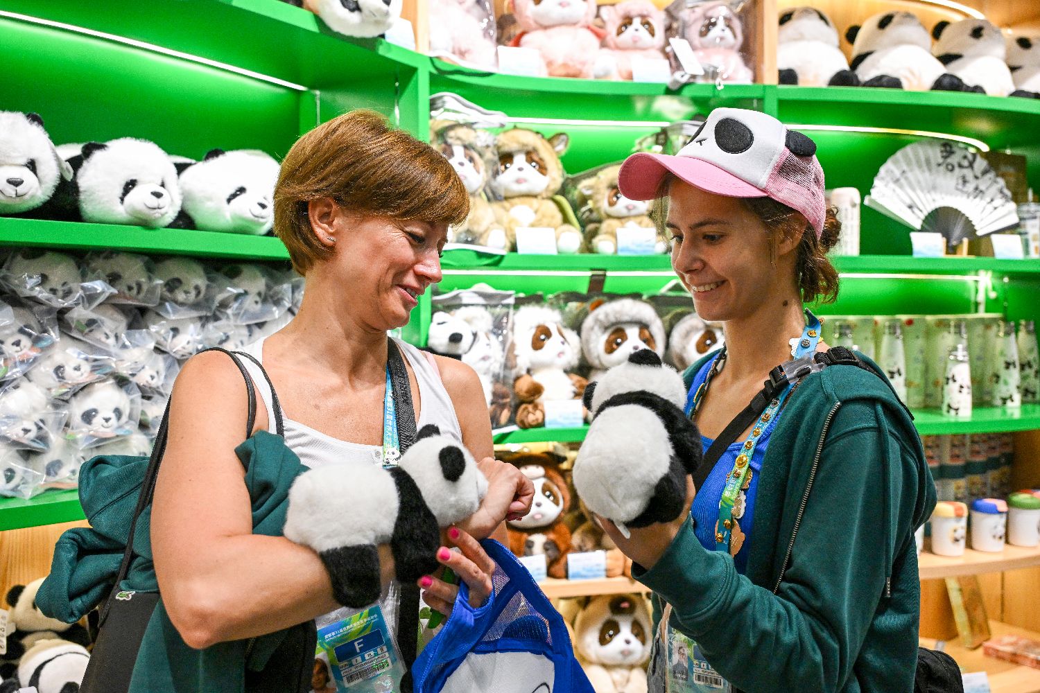 图为匈牙利选手凡妮·皮格尼茨基(PIGNICZKI Fanni)(右)选购大熊猫玩偶。此前,她在艺术体操个人全能比赛以及球操比赛中获得金牌。(图片来源:中新社)