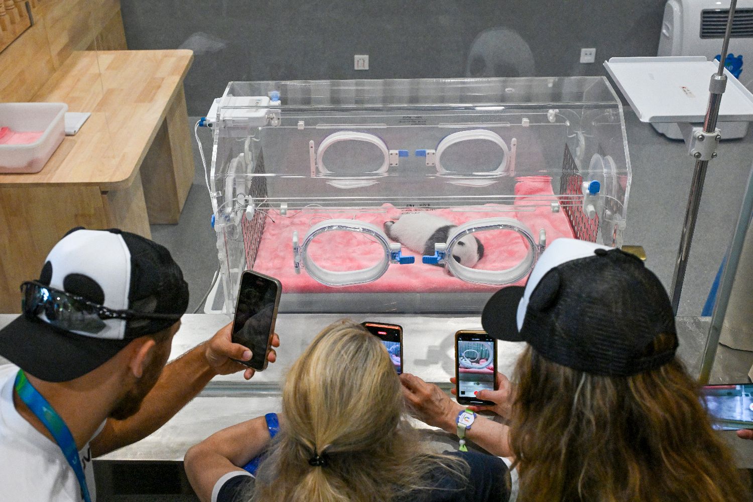 图为运动员围观大熊猫幼仔。(图片来源:中新社)